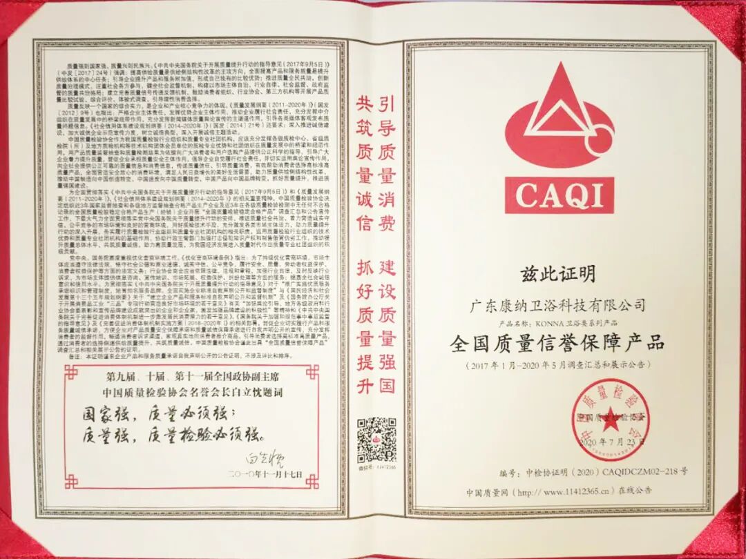 近日,由中国质量检验协会组织开展了2017-2020年度“全国质量检验稳定合格产品”调查汇总和展示公告工作,旨在以产品质量国家监督抽查和相关质量检测结果为依据,向消费者选购产品提供公正、科学、权威的指导。中国质量检验协会是全国质量检验机构及质量检验工作者和全国质量监督工作者组织的专业社团组织,在质量监测和检验领域具有非常强的权威性和公信力。经过层层筛选,康纳卫浴荣获“全国质量信誉保障产品”、“全国质量检验稳定合格产品”两项权威认可,充分肯定了康纳卫浴过硬的产品质量。