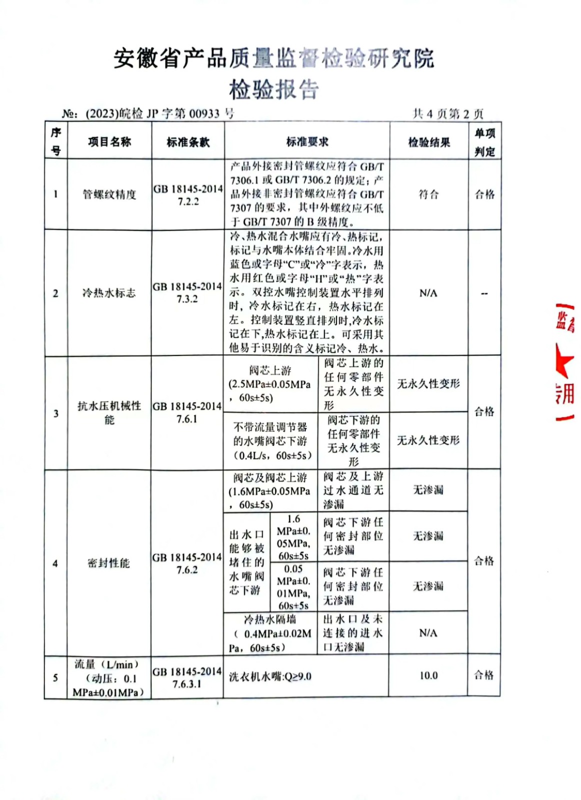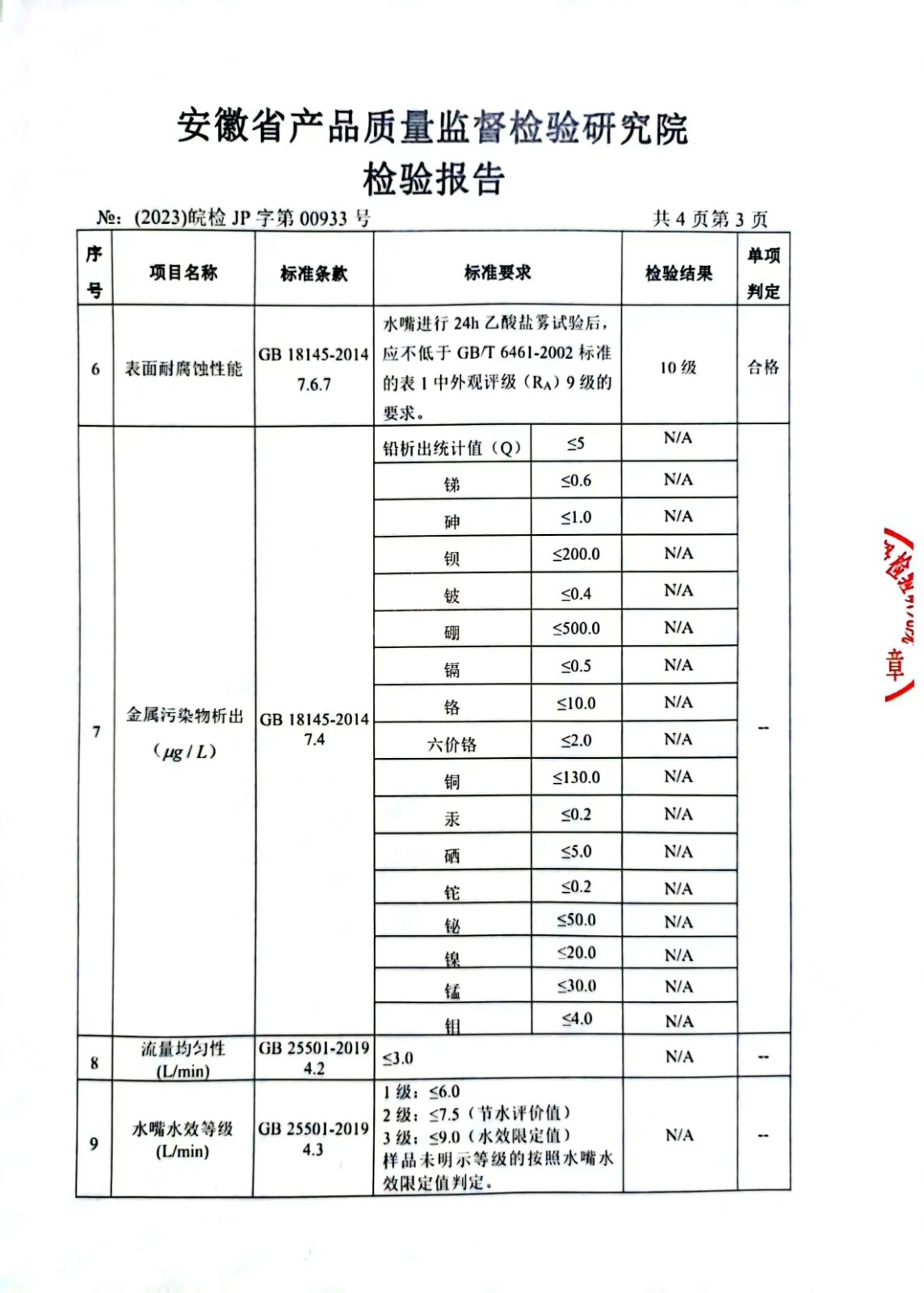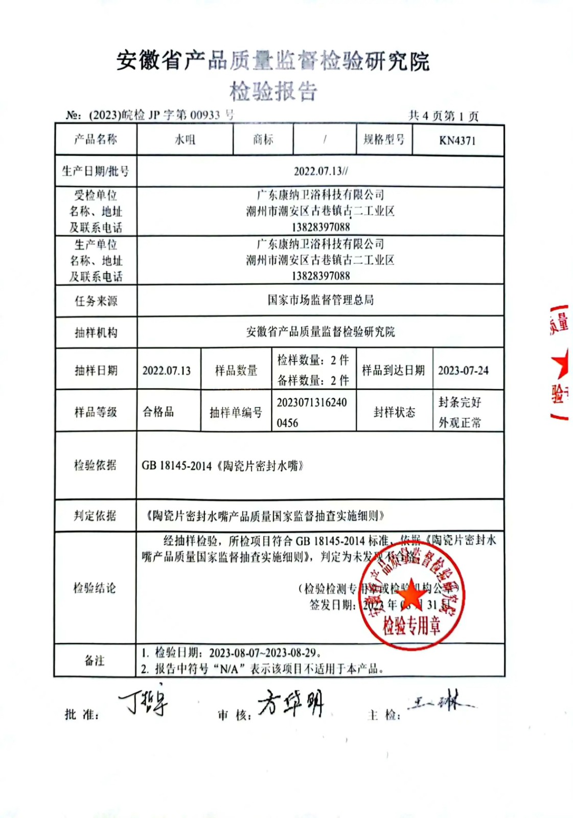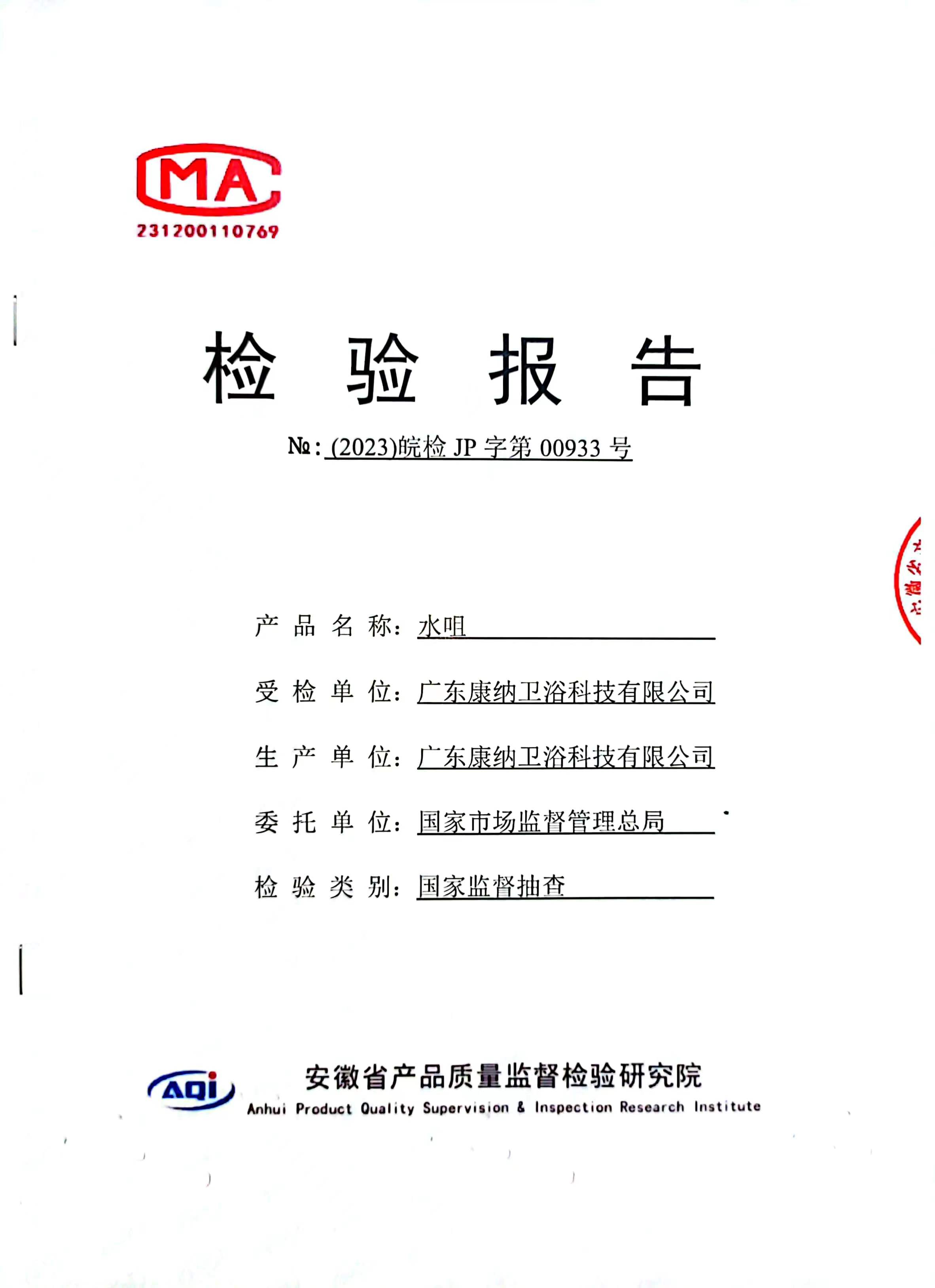 近日,受国家市场监督管理总局委托,安微省产品质量监督检验研究院对bat365正版唯一官网水咀产品进行了监督抽查,并于2023年9月1日颁发了《检验报告》,报告指出,康纳卫浴水咀产品所检项目均符合国家标准要求。这是康纳卫浴凭借在品牌、品质、技术等多方面的领先优势,连续20年在国家质量监督抽查中保持产品合格,为广大消费者创造了大量高质量的健康卫浴产品。