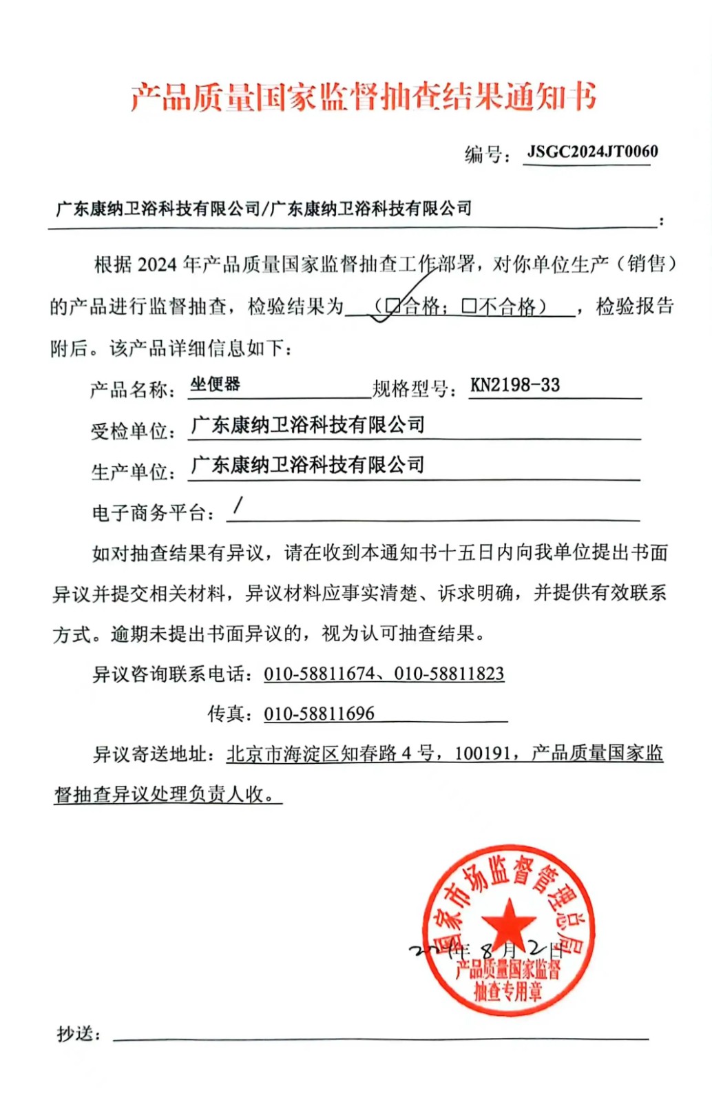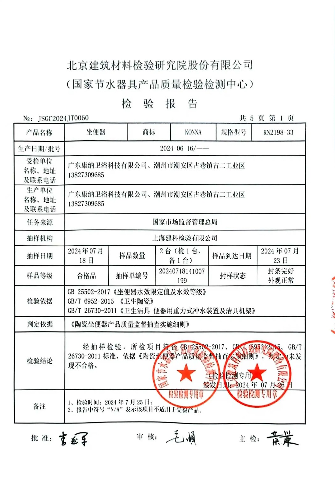 产品品质是企业发展基础,也是企业品牌赢得市场的核心要素。根据2024年产品质量国家监督抽查工作部署,受国家市场监督管理总局委托,北京建筑材料检验研究院股份有限公司对卫浴企业进行产品质量抽查,康纳卫浴坐便器KN2198-33被随机选为检测样品,经检测所有项目均符合国家标准要求,再次向市场证明了康纳卫浴作为行业标杆对质量的完美追求。至此,康纳卫浴已连续21年在国抽中获得合格!